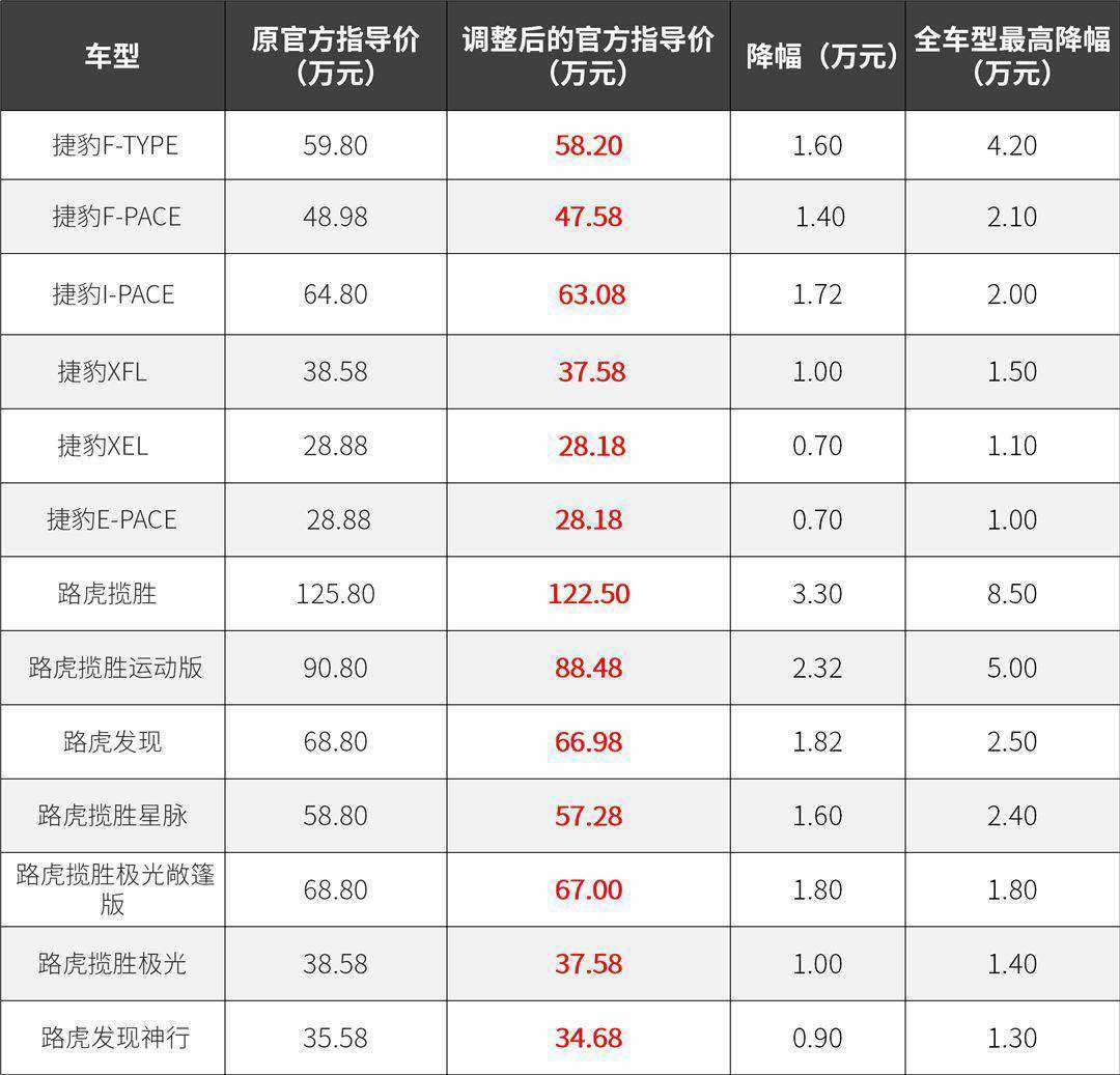 捷豹路虎方面,下调在华销售的捷豹品牌全系车型厂商建议零售价,捷豹品牌最高降幅8.5万元,捷豹品牌最高降4.2万元。