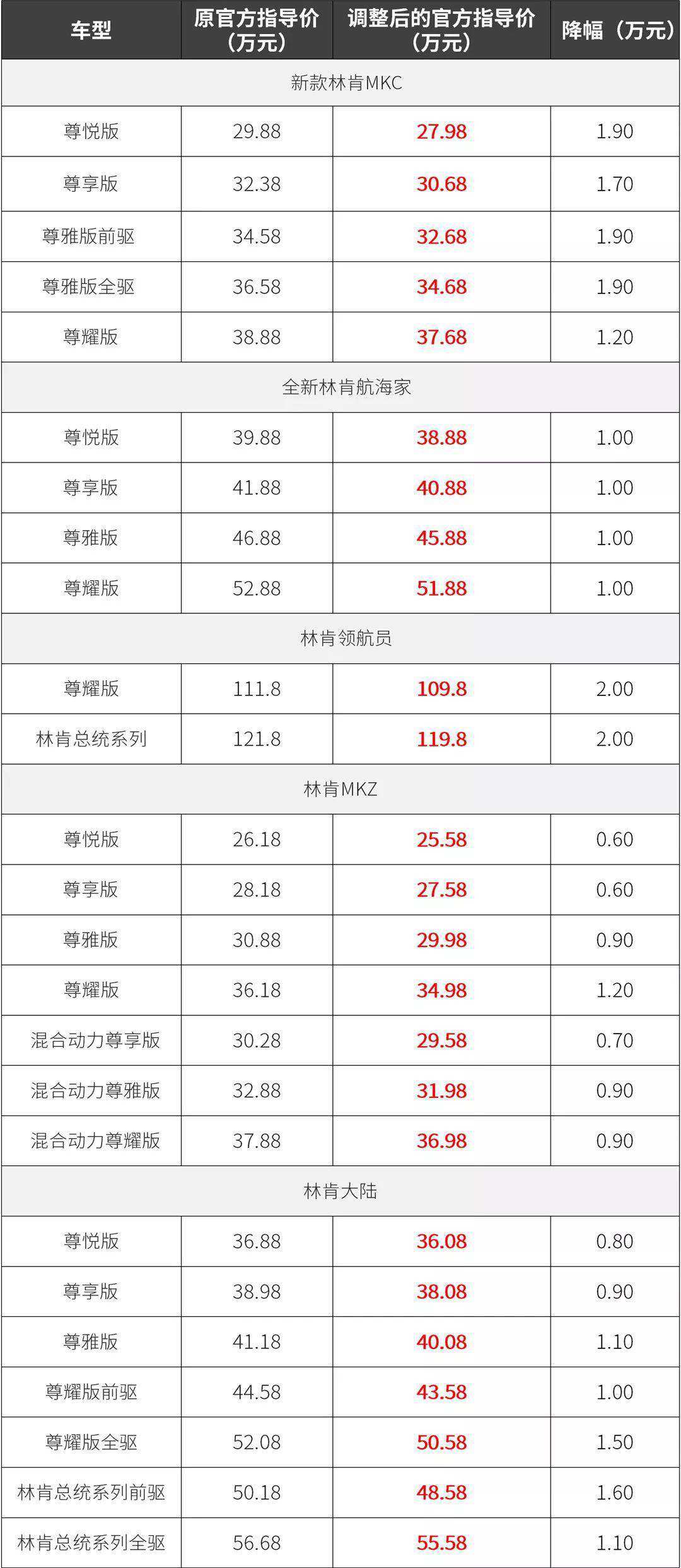 林肯诚意最足,全系车型售价下调且全部公布,新款林肯MKC车型最高降幅1.9万元;航海家车Nautilus车型最高降幅1万元;领航员Navigator车型最高降幅达2万元。林肯在售车型全部均为进口车型,首款国产车型在今年下半年正式上市。