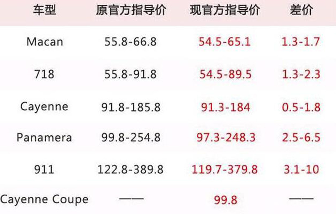 保时捷降价幅度5000元-10万元不等,其中718下调1.3-2.3万元,Panamera价格下调2.5-6.5万元,Macan下调1.3-1.7万元,卡宴下调0.5-1.8万元,优惠最大的当属保时捷911,最高降幅达到10万元。
