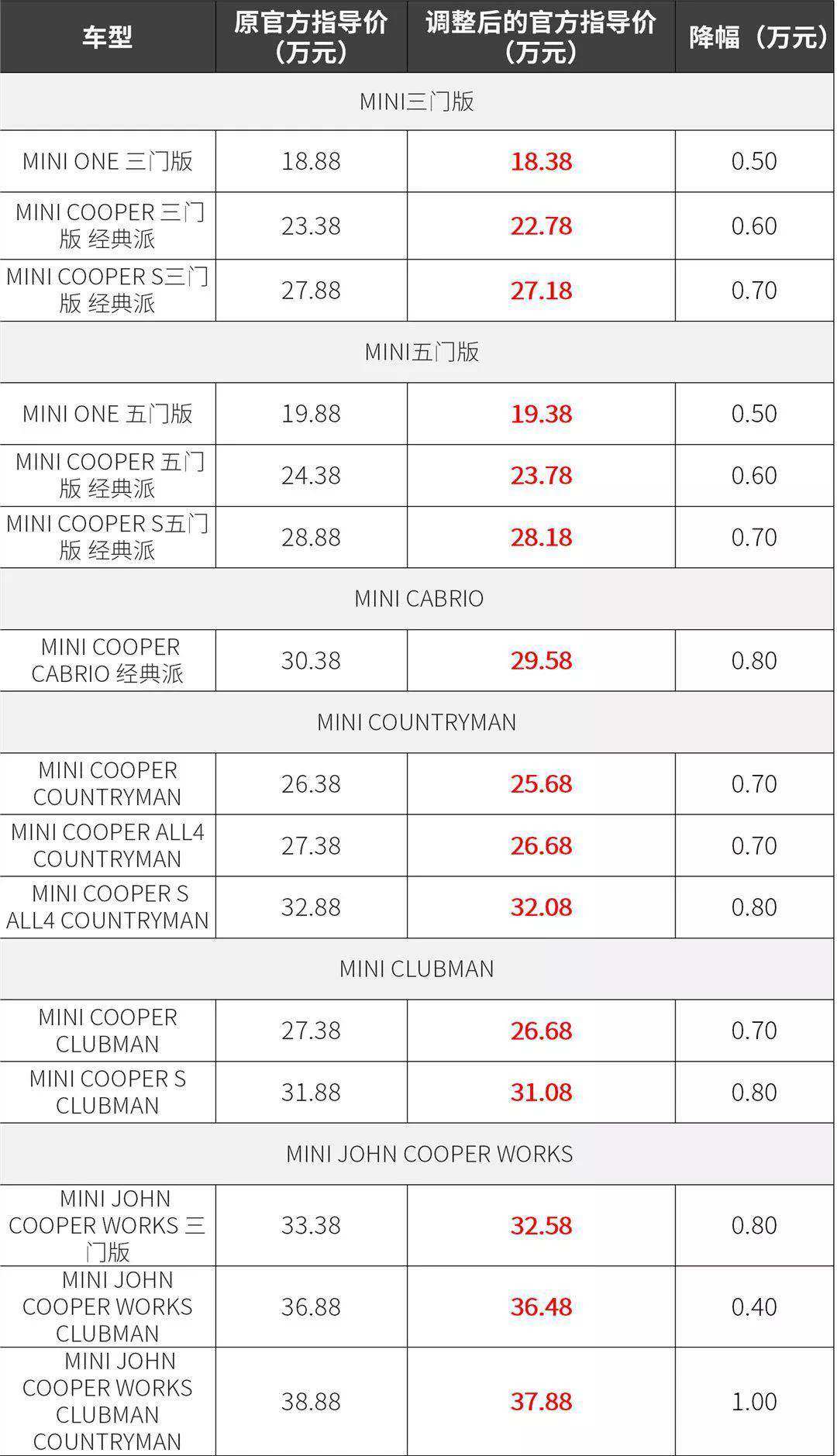 宝马下调中国在售车型厂家建议零售价,其中降幅最高为宝马 M760Li xDrive达6万元,MINI品牌车型价格也进行了调整下调 ,如:MINI ONE三门版的入门价格调整为18.88元;MINI COOPER ALL4 COUNTRYMAN价格下调后为27.38万元。
