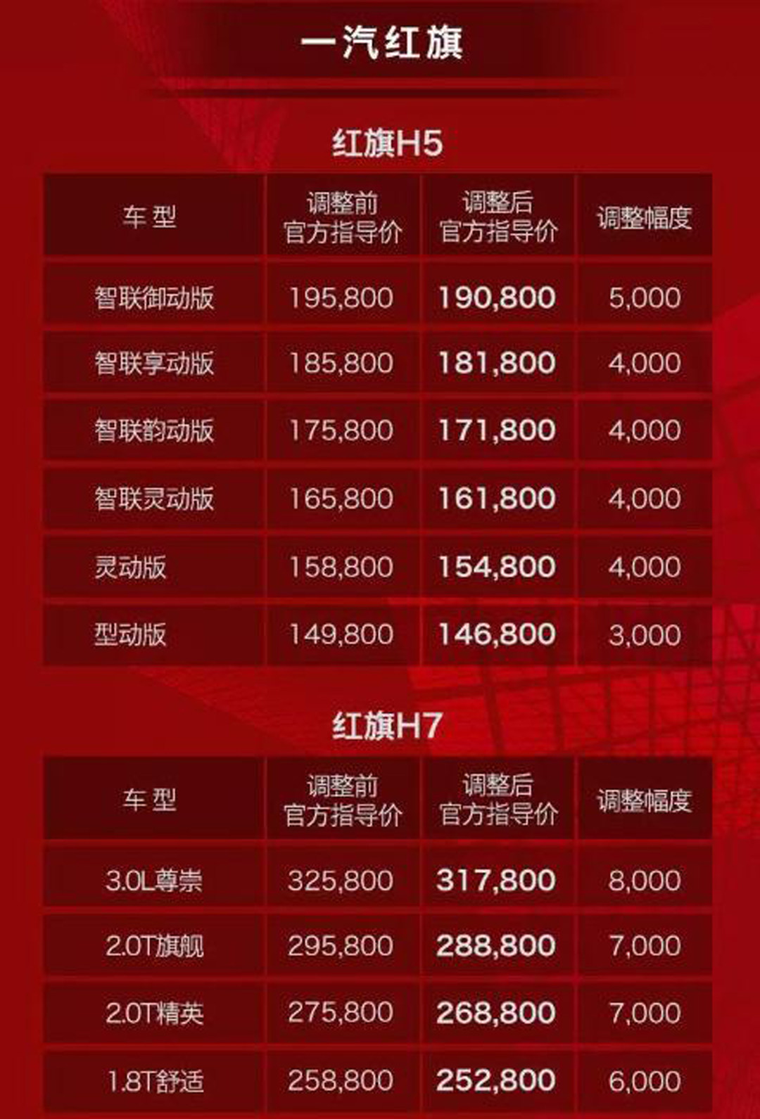 一汽红旗两款车型红旗H5和红旗H7售价均有下调,其中红旗H5降幅3000-5000元,红旗H7最大降幅达8000元。