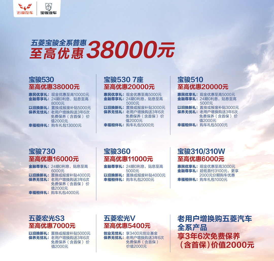 五菱宝骏品牌全系车型调整,包括宝骏530、宝骏530七座、宝骏510、宝骏360、宝骏730等多款车型提供现金+金融补贴+置换补贴等综合优惠,最高达3.8万元;五菱品牌提供最高0.7万元的综合优惠。