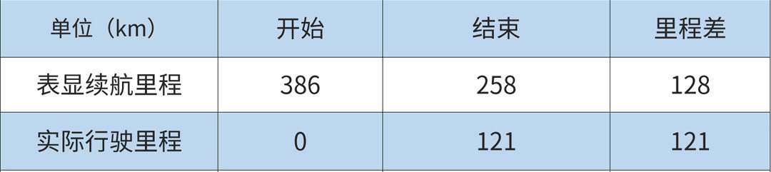经过大约两小时的驾驶,我们从广州驱车到达深圳,实际行驶了121km,而此时表显的续航里程还有282km,表显的里程差为128km。