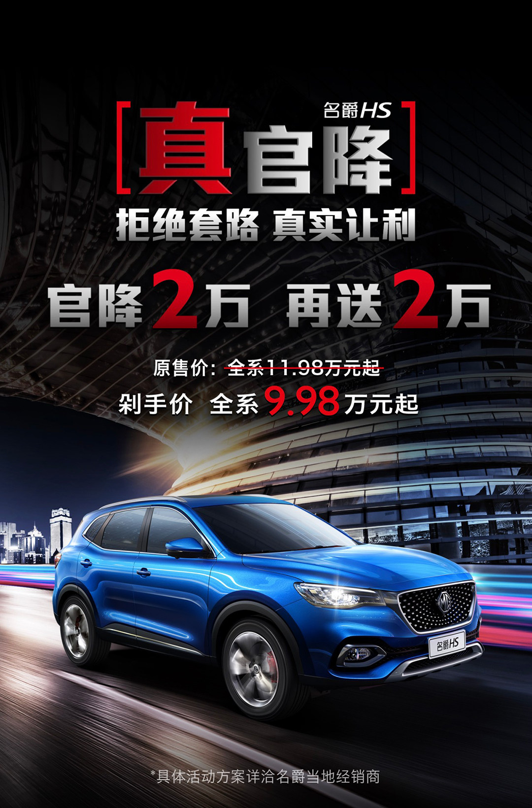 响应国家减税政策,让消费者真实获利,即日起上汽名爵下调名爵HS全系车型官方指导价,其中30T车型下调2万,下订再送2万红包;20T车型下调1万,下订再送1.5万红包,同时新增一款售价9.98万车型。官降+红包优惠后的名爵HS价格优势更加明显,竞争力也得到进一步的提升。