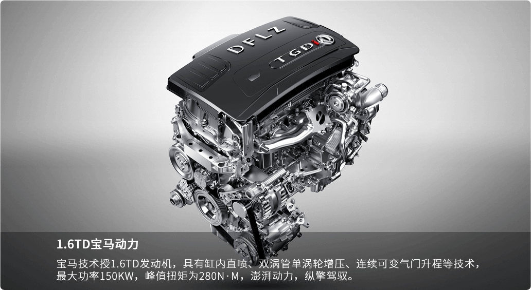 东风风行T5L提供三种动力:1.8T+6MT、1.5T+CVT、1.6+7DCT。其中,1.6T动力最值得关注,因为它的部分技术是宝马授权的,而且具有缸内直喷、双涡管单涡轮增压、连续可变气门升程等技术,最大功率150kW,最大扭矩280N·m,动力响应和燃油经济性之间得到了不错的平衡。