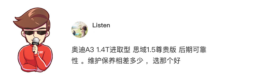 这个很明显是一个鸡头凤尾选择的问题,如果说选择A3之前没想过为了面子的那肯定是骗人的。不过选择最低配的A3也会相对有些牺牲,就例如在配置上A3 35TFSI 进取型比思域220TURBO尊贵版少了倒车影像、定速巡航、可变转向比、天窗、无钥匙进入/启动、真皮座椅、前排座椅电动调节、GPS与前雾灯。先不说后期保养的费用与保险都会贵上起码一半,在燃油上A3必须使用95号以上汽油,而思域则是92号以上就可以了。如果这些额外的费用都能接受,那么操控更好、底盘更扎实的A3会是你最好的选择。