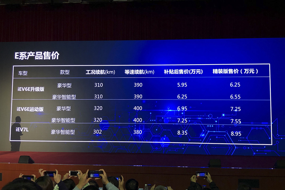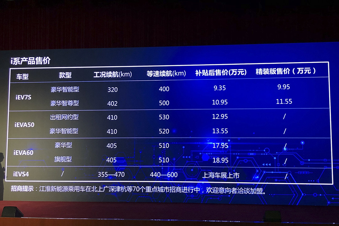 除了上面重点推出的iEVS4外,此次JAC品牌日还发布了江淮新能源第三代产品全线价格,E系、i系双系产品体系全力打造A00、A0、A、B四级别新能源乘用车产品矩阵。从发布信息来看,江淮新能源乘用车在2019年新能源补贴过度期提供“保价”政策的同时,还对产品“增程”,续航进一步提升。这一举措相信会掀起新能源乘用车的购车热潮。