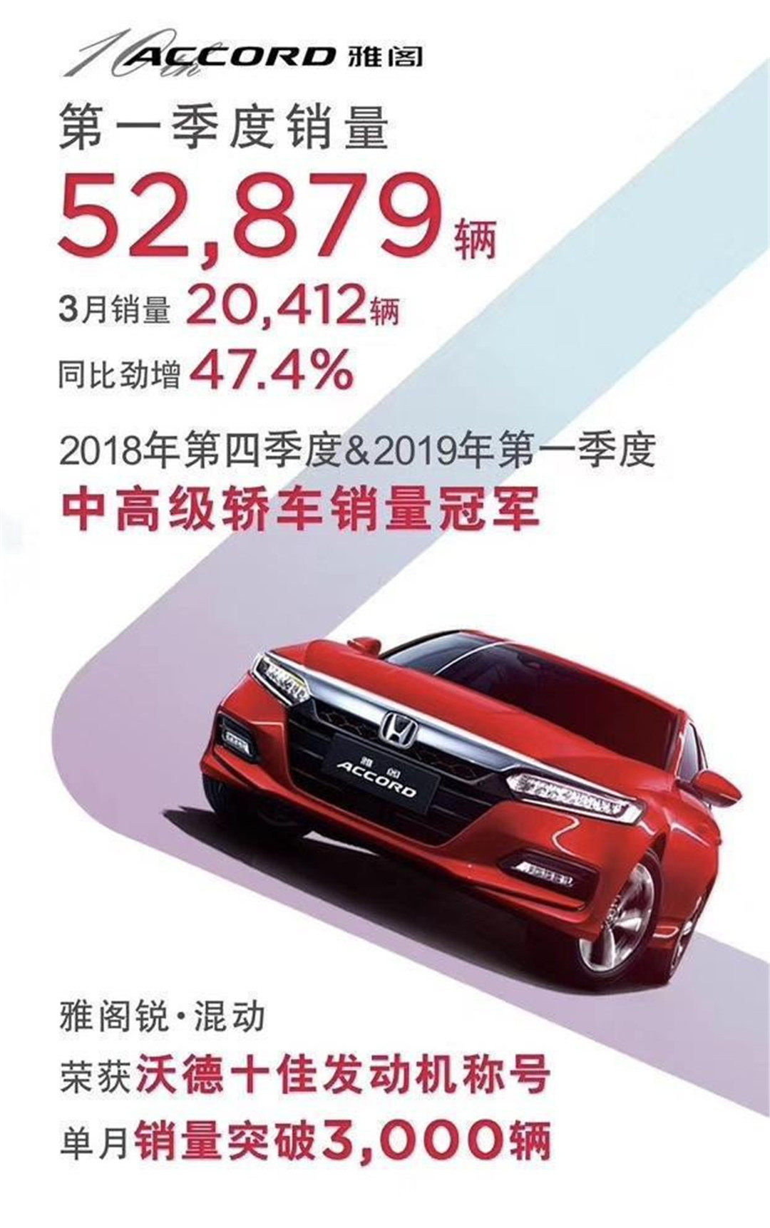 广汽本田进入2019年以来,销量一直稳步上涨,根据官方公布的3月份销量数据,3月份广本全系车型总销量为7.2万辆,同比增长27.5%。其中雅阁销量为2.04万辆,同比增长47.4%。