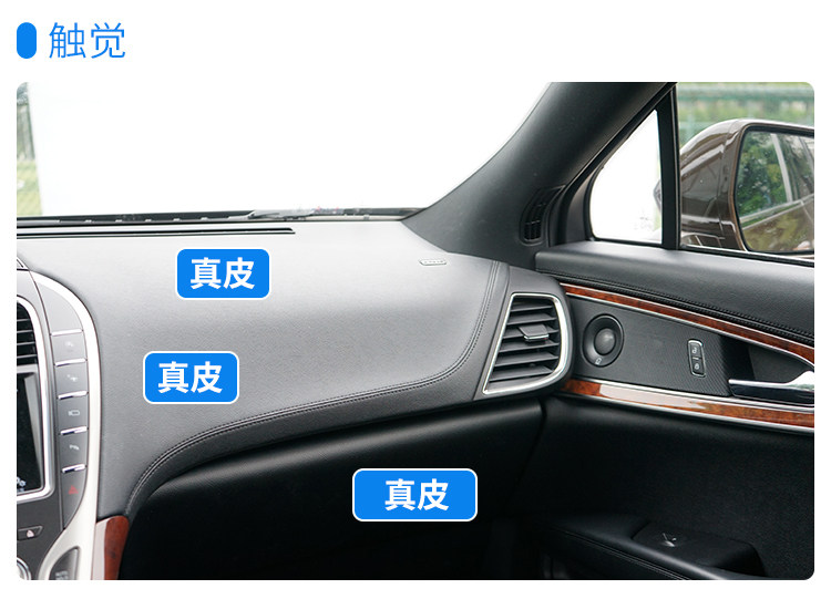 除了杯架两边的木纹饰板是真塑料之外,其余极大部分地方都是采用触感较好的真皮材料,顶棚也是采用绒布材质,好感进一步增强。