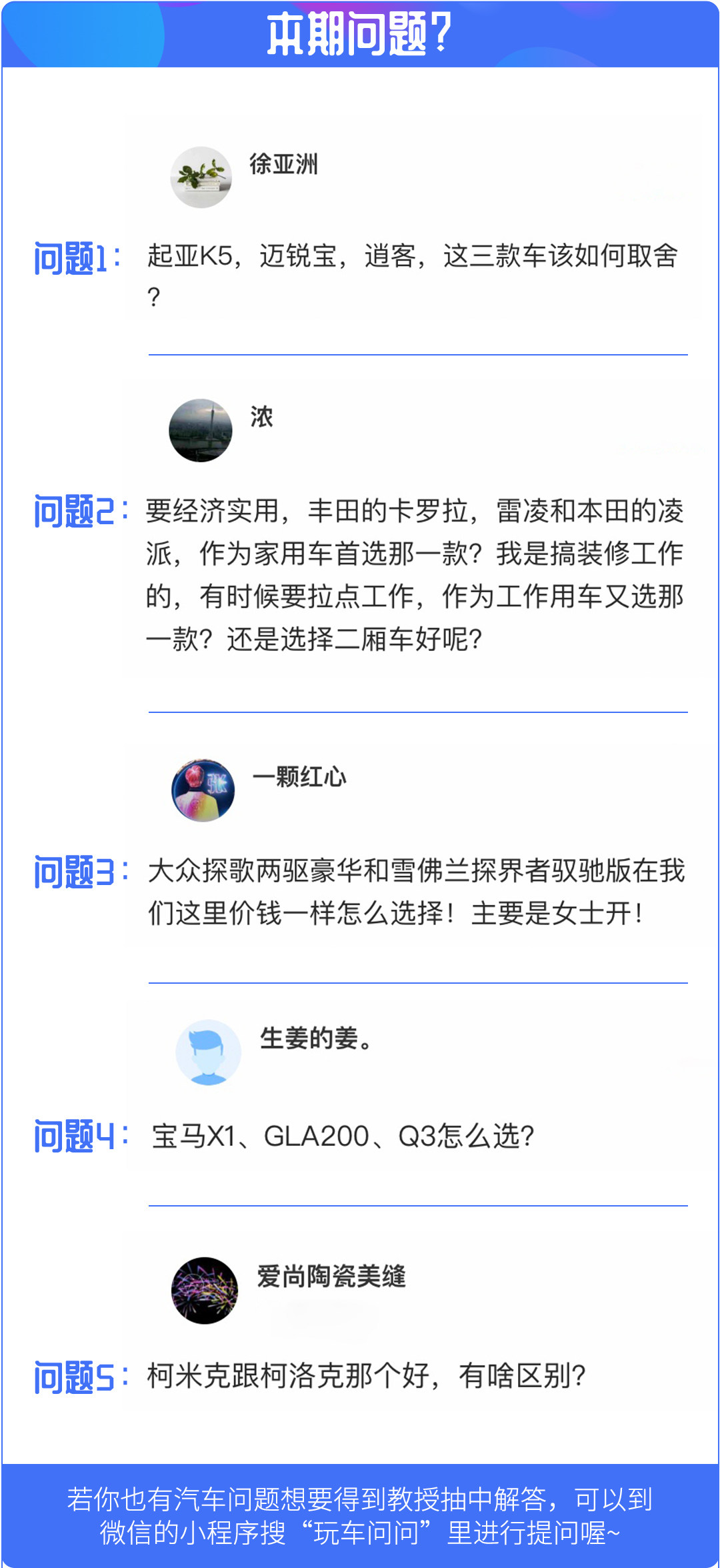 在网友问答栏目中教授将会在小程序-玩车问问里挑选5个问题进行回复,如果对购车、用车有什么疑问的话,欢迎点击下方玩车问问小程序,有许许多多非常厉害的技师为你解答喔!