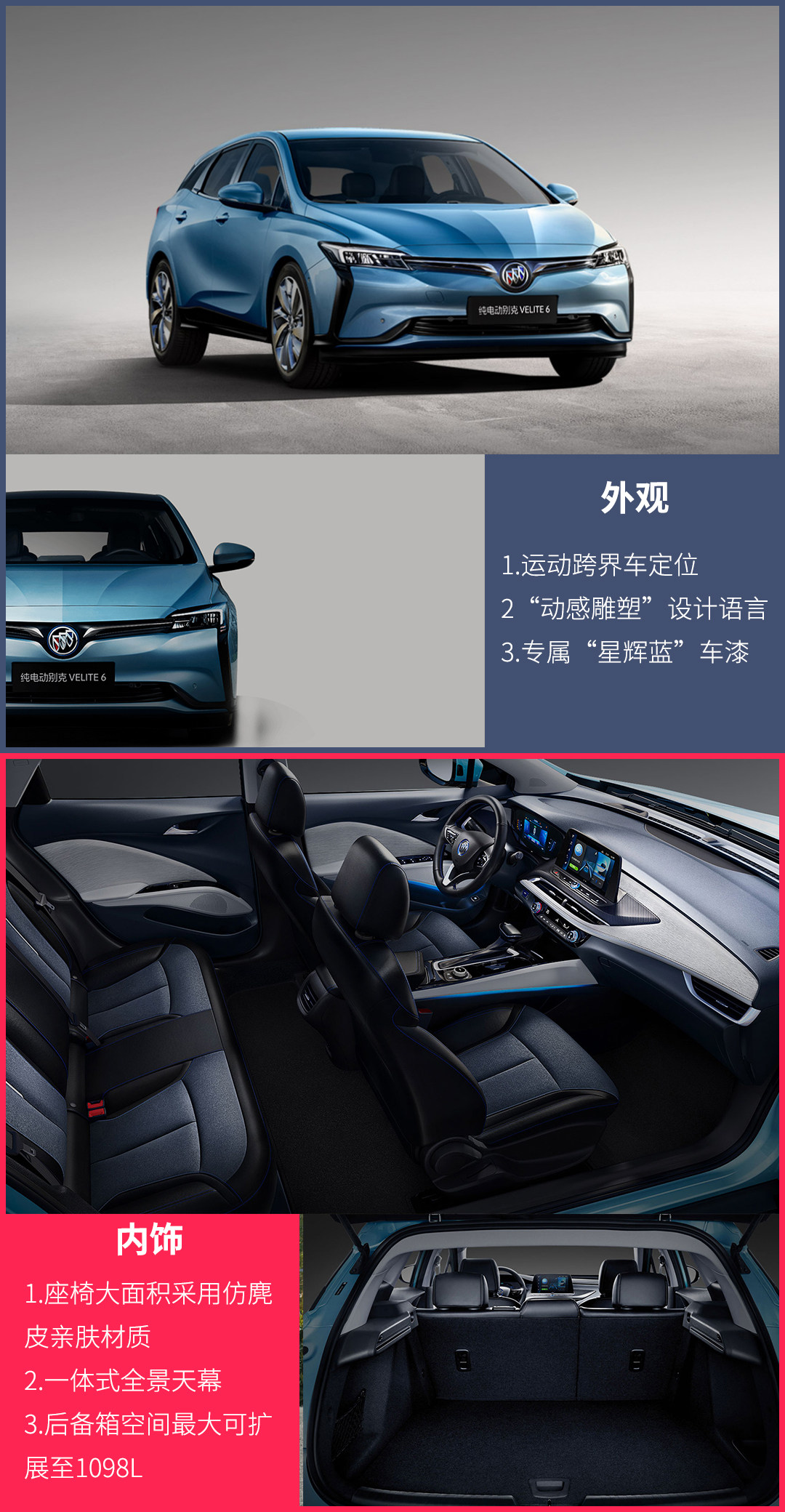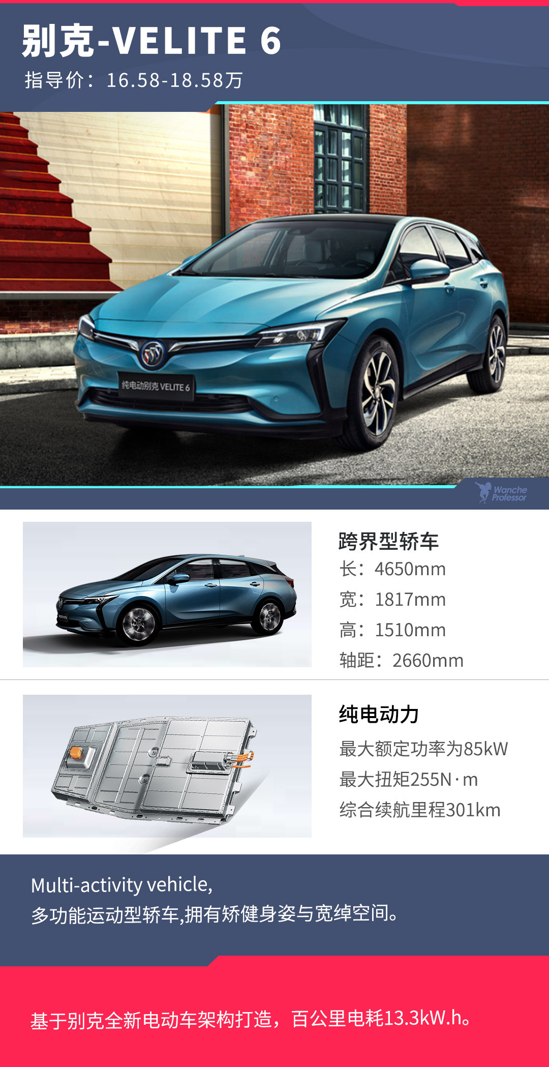 VELITE 6基于别克全新电动车架构打造,电动机最大额定功率为85kW,最大扭矩255N·m。电池容量为35kW·h。综合续航里程为301km。