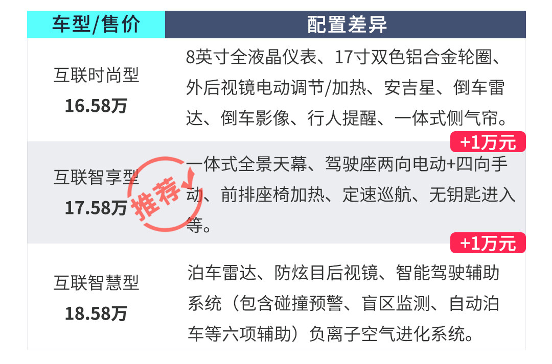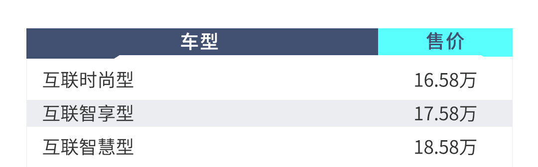 新车共有3款车型,分别是补贴后售价为16.58万的互联时尚型,17.58万元的互联智享型和售价为18.58万元的互联智慧型。