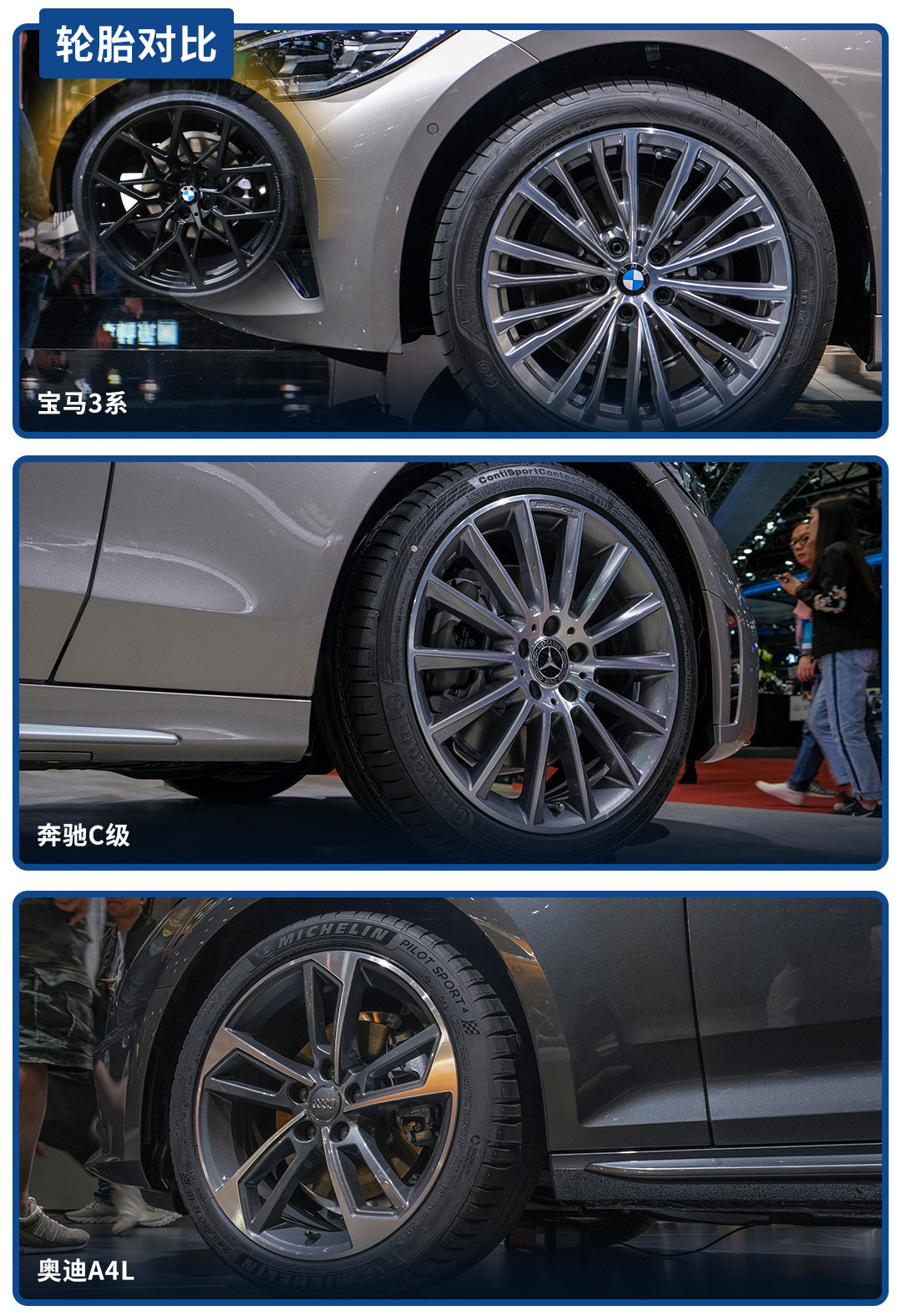 除了豪华版以外还有M套件版的3系轮毂,采用熏黑处理,还有运动设计的轮毂造型;C级的轮毂是AMG样式的轮毂,运动感也较强;A4L的轮毂同样比较清秀简约,但力量感很强。