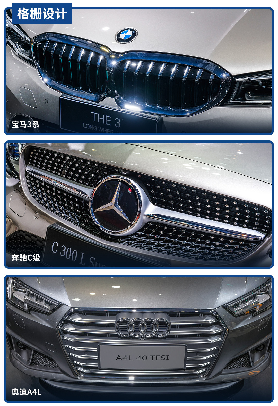 格栅造型方面3系是越来越大也越来越尖,M套件熏黑处理运动感更强;C级其实有几款造型,能兼顾运动、豪华两大风格;A4L的六边形设计也是家族风格,但现今来说并不算抢眼。