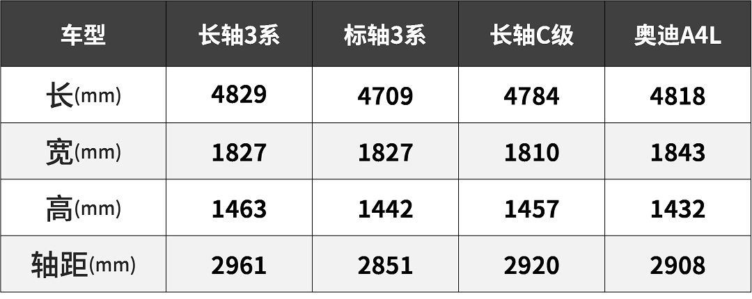 车身侧面3系和C级的线条都比较复杂有动感,C级相对柔润,A4L一根线贯穿车身,简洁但不够突出,尺寸方面加长后的3系Li不管车长还是轴距都是三者当中最长的。