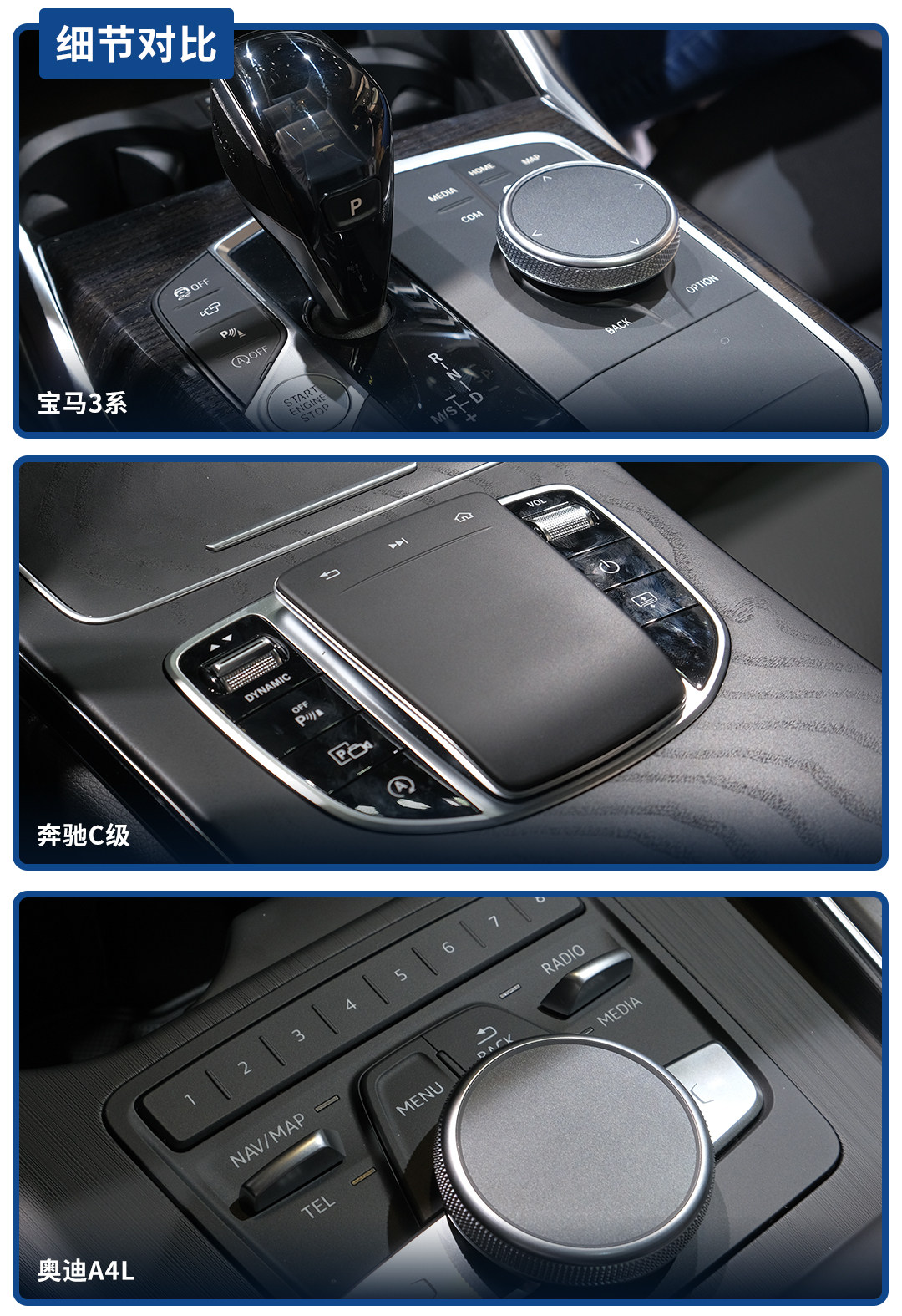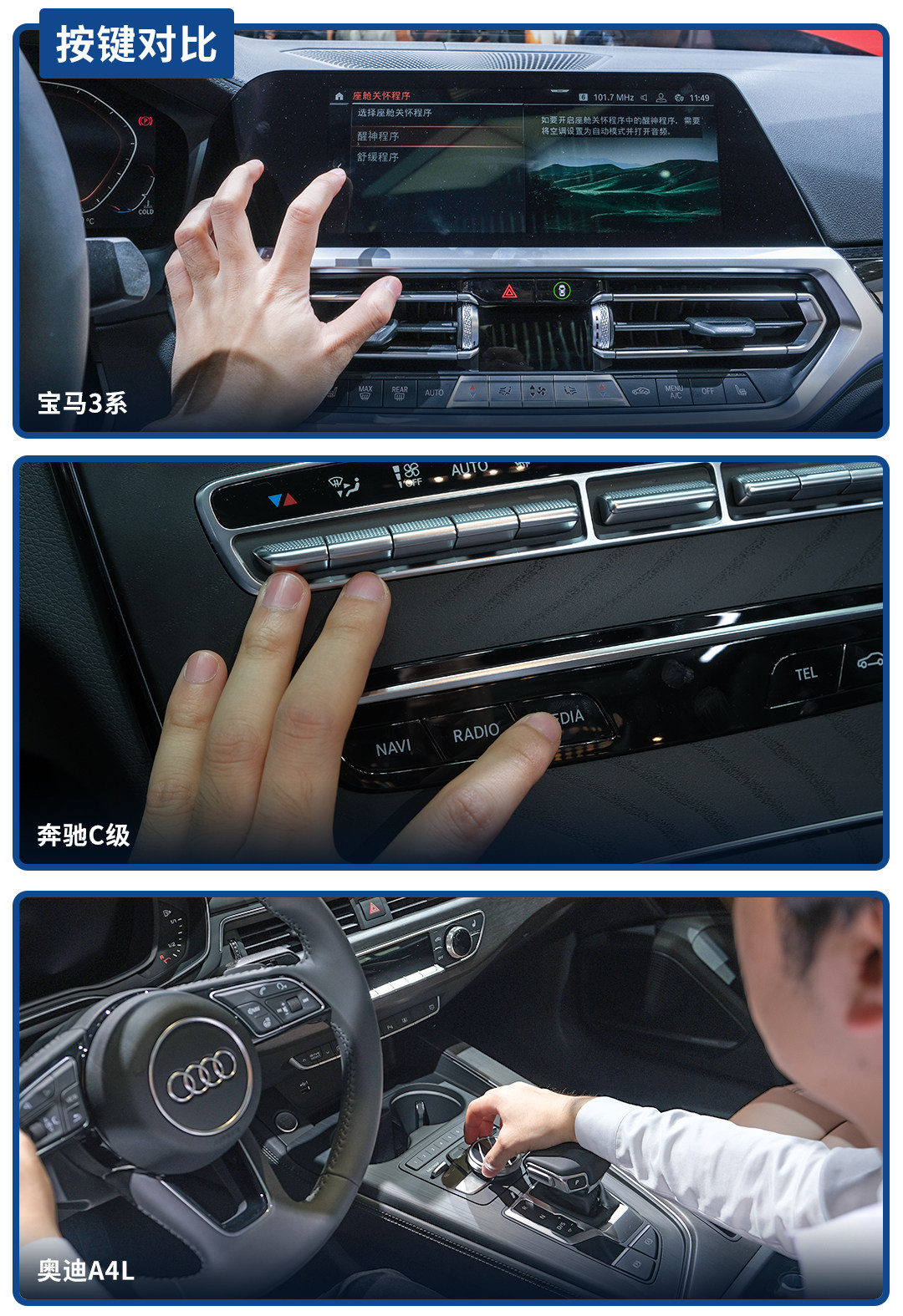 车内按键的质感从松到紧依次是C级<3系<A4L,C级的按键摸上去就有松动移位,没什么阻尼感,所以看起来是挺不错,其实摸起来质感一般;3系是适中的,按键按下去有一定的阻尼感,教授比较喜欢这种;而A4L的按键质感比较硬,键与键之间不是分开的,手感比较生硬。