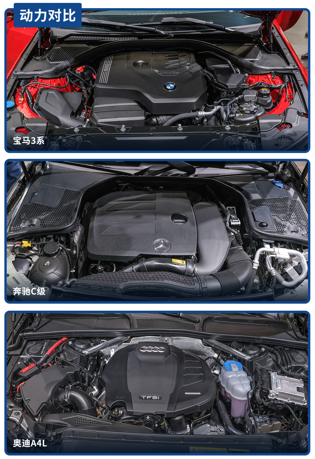 动力总成方面,三者都没什么变化,3系依然是B48系列发动机,所以三者依旧是我们熟悉的三套动力总成,从动力总成的角度来说,3系应该算是“大改款”;C级是三者中率先大力推行48V轻混系统的,机电一体化态度是比较积极的;相比之下A4L依然保持纯汽油动力总成,而且功率数据等都不算太有优势。