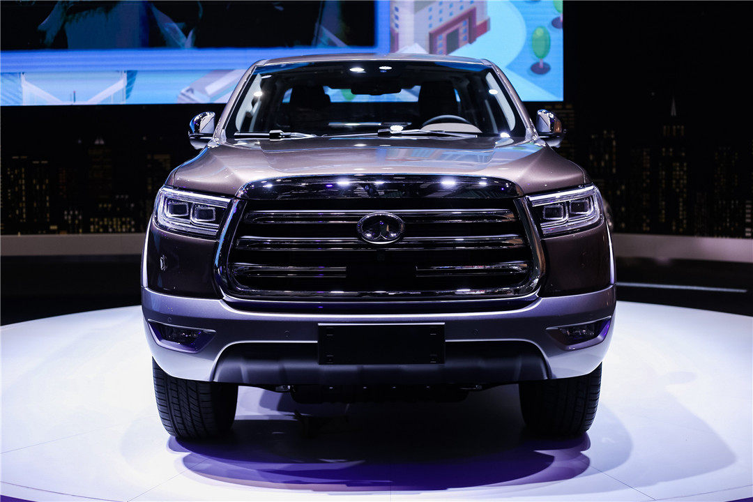 炮系列乘用版皮卡的身材异常高大威猛,前脸采用梯形大口式进气格栅并配以镀铬装饰条,宽大粗壮的前保险杠让车头力量感十足。