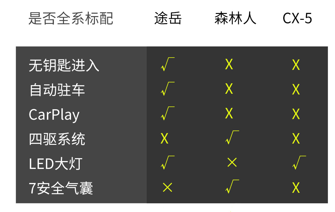 无钥匙进入、自动驻车、CarPlay这些实用配置都是途岳标配的,顶配车型上还有四驱系统、自动泊车、全景摄像头等配置。所以,在配置的丰富上途岳是三辆车中NO.1。而森林人的亮点则是全系标配四驱系统、7安全气囊,个别车型配备EyeSight系统(主动安全系统),森林人的竞争力之一是安全性能强。CX-5低配车型的配置就比较低了,仅仅是标配LED大灯,想要好一点的享受就得买中高配,顶配车型上出现的Bose音响和抬头显示则是亮点。