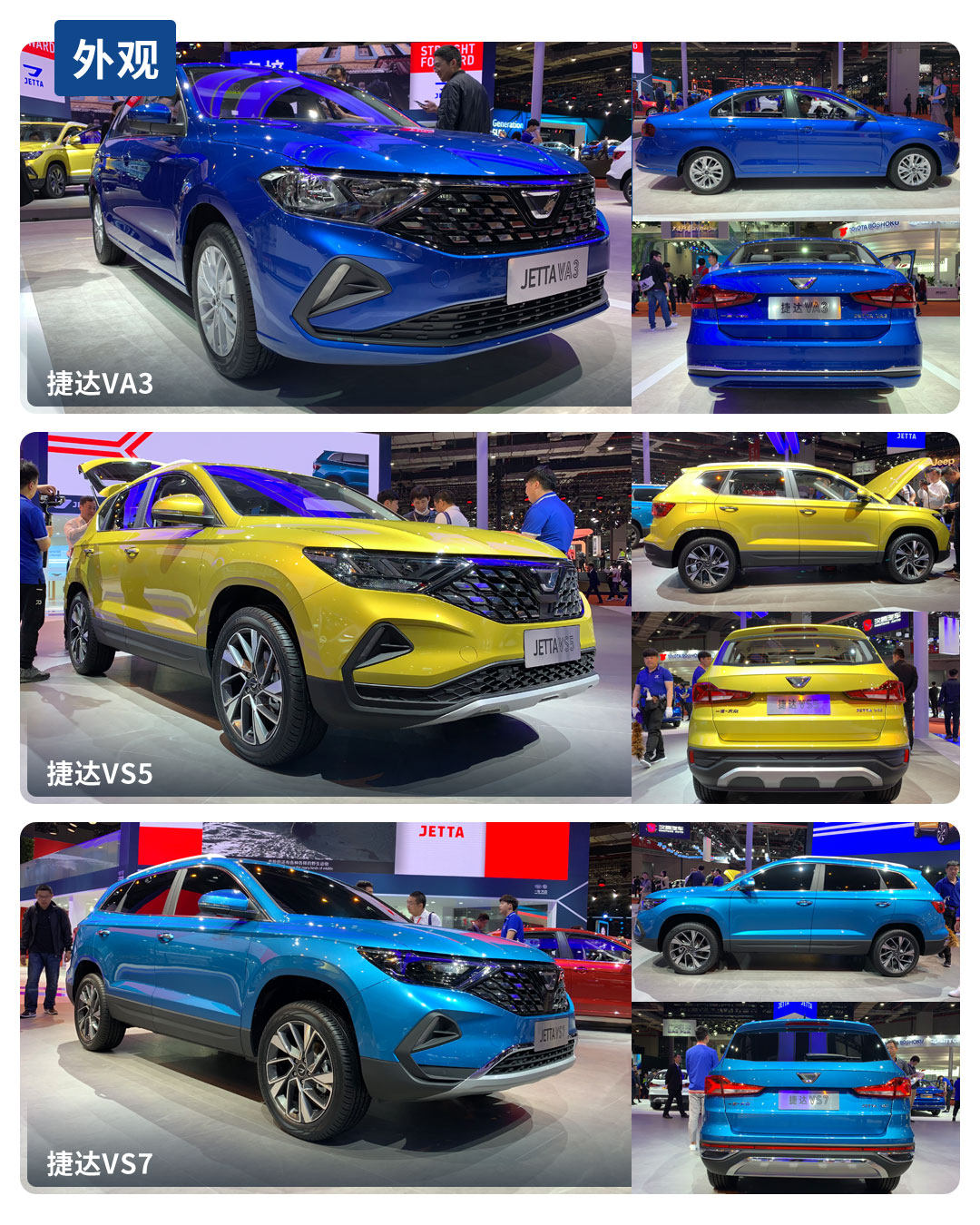 VA3的车侧其实跟捷达很神似,不管是贯通车尾的腰线还是直线条的铺垫,依旧是捷达车型的味道。而VS5跟VS7的车侧依旧是德味的大众系设计手法,锐利的线条,双腰线,都是我们熟悉的配方。而捷达这三款车的车尾在大灯上有别于大众车,更加修长以及更加不规则的造型则显得更加年轻和运动,Y字形的LED灯带识别度进一步提高。