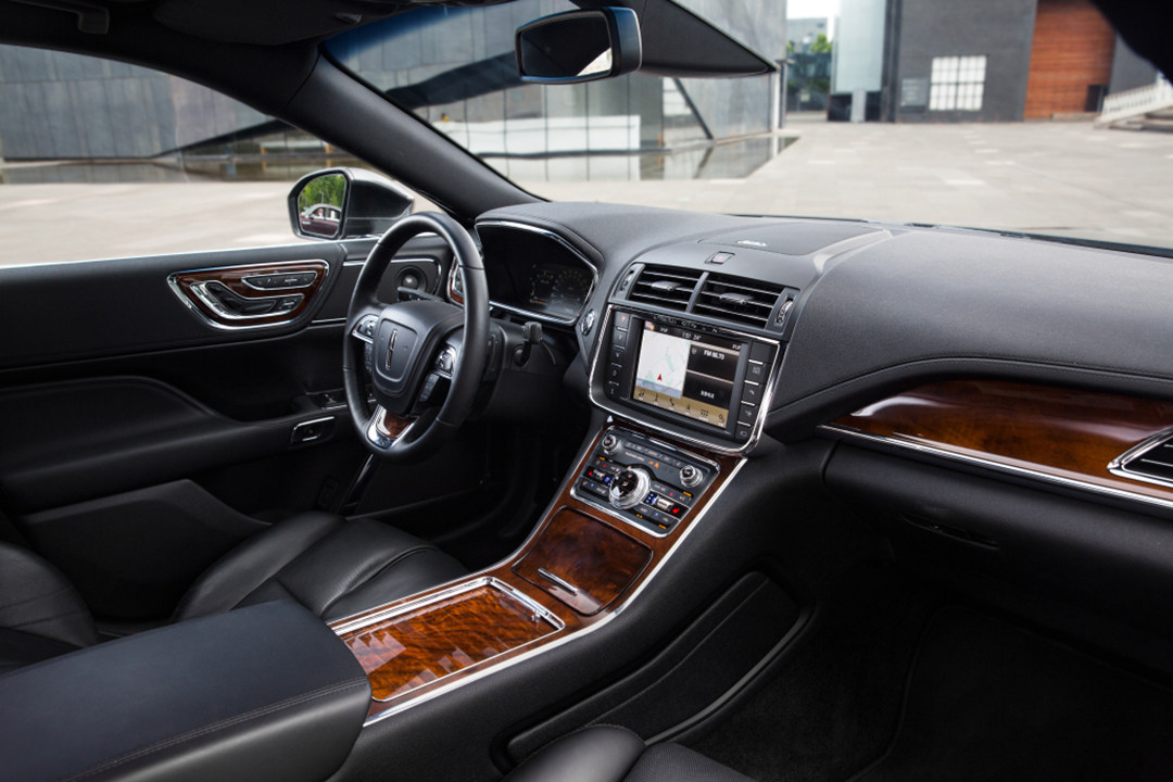 林肯大陆的内饰设计说不上年轻,走的是传统美系豪华路线,传统T型中控台上覆盖着大面积皮革和木饰板,配合镀铬饰条的点缀,豪华气息来得非常直接粗暴。