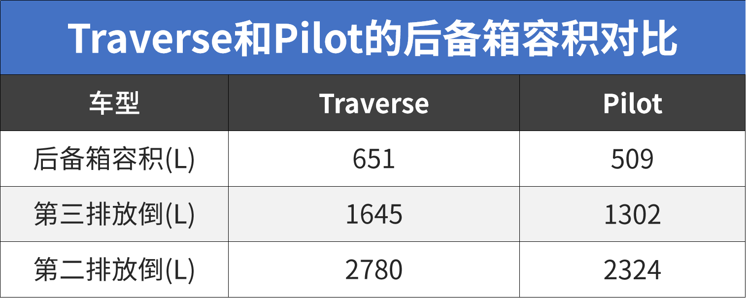 在空间性方面,假如在没有放倒第三排的情况下,雪佛兰Traverse和本田Pilot两者的后备箱容积分别为651L和509 L,对于一般行李装载来说,没有太大的问题;而在第三排放倒之后,两者分别能够获得1645L和1302L的空间容积;而当第二排座椅放倒之后,两者分别能够获得2780L和2324L的理想可观的容积。从总整体的表现来看,Traverse的空间优势比较明显。