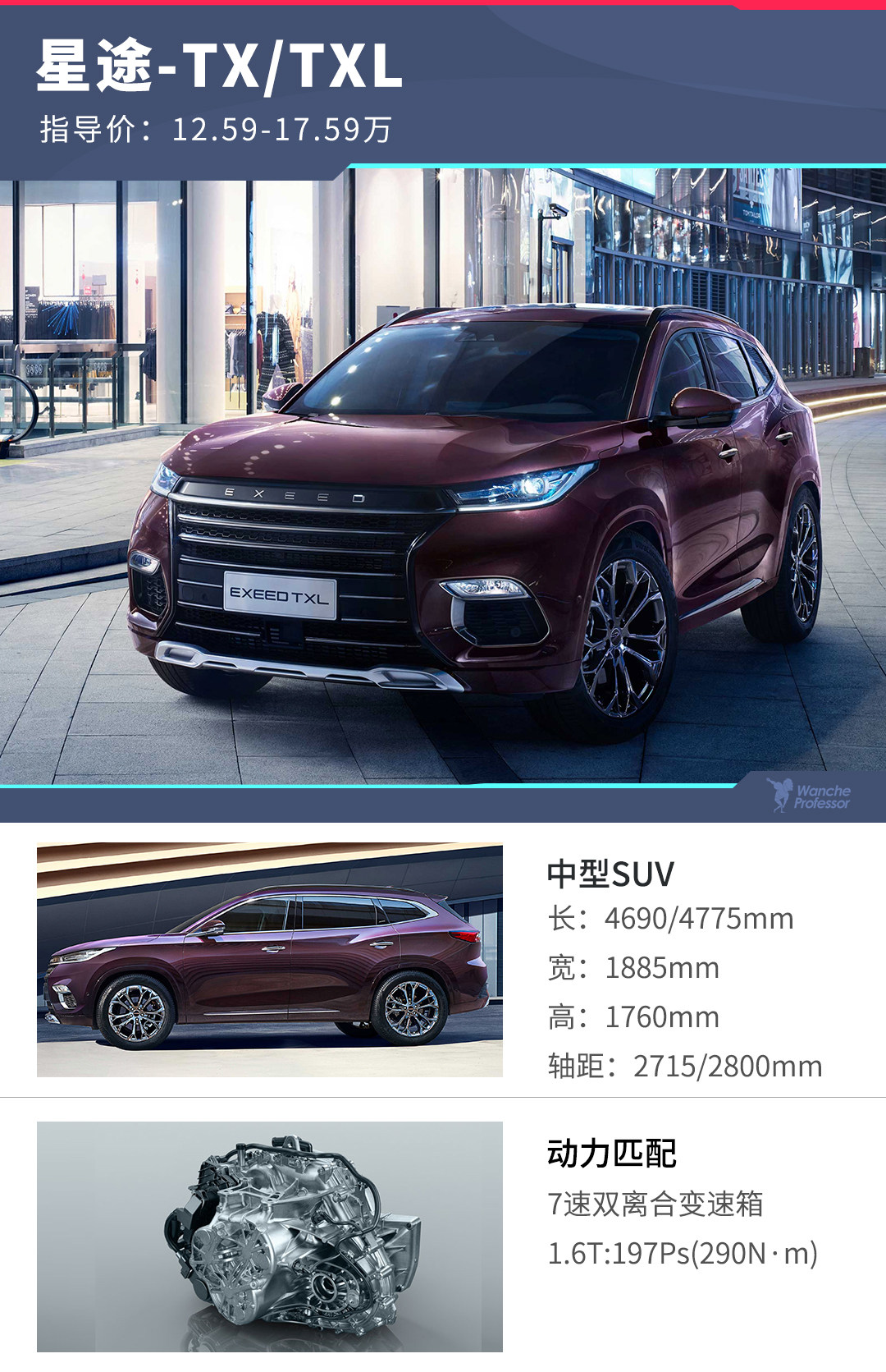 星途是奇瑞推出的全新高端品牌,星途-TX是首款上市的车型,其中TX为标准轴距版本,长轴距版则为TXL,均定位于五座中型SUV。