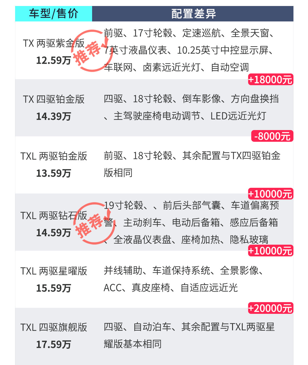 4月16日,星途TX/TXL正式上市,新车共有6款车型,其中TX拥有2款车型,TXL拥有4款车型,售价区间为12.59-17.59万元。并且为消费者提供10或100万公里质保、零首付2年低利率或3成首付零利率,与前1000名客户尊贵权益三重超值福利政策。那么买哪款才是最划算呢?教授现在就帮你分析。