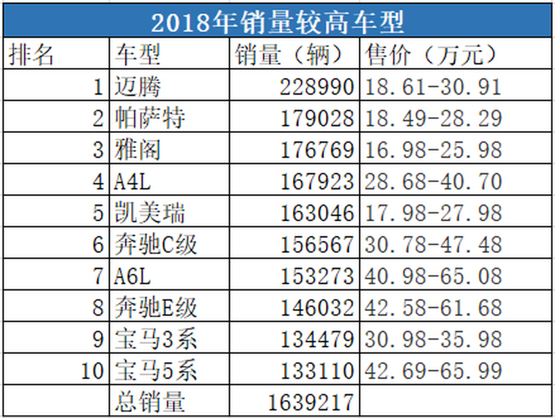 到了2018年,售价更高的迈腾、帕萨特、雅阁、A4L、凯美瑞、奔驰C级、A6L、奔驰E级、宝马3系、宝马5系加起来的销量也有163.9万。