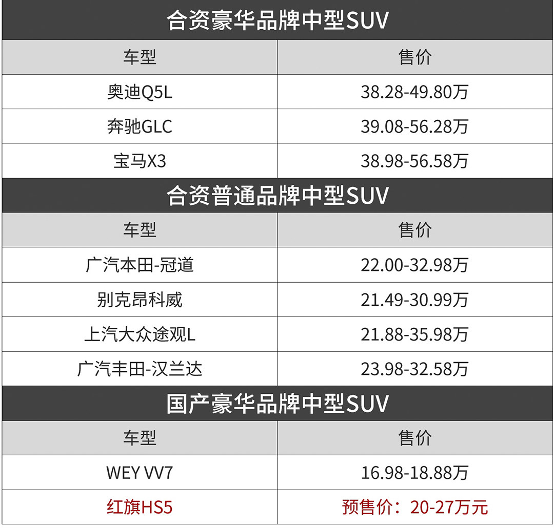 那价格呢?红旗HS5即将在5月1日开启预售,预售价为20-27万元。教授预计正式上市时新车起售价会压到18.98万元左右。这样的价格在目前中型SUV市场里,算是比较有吸引力。