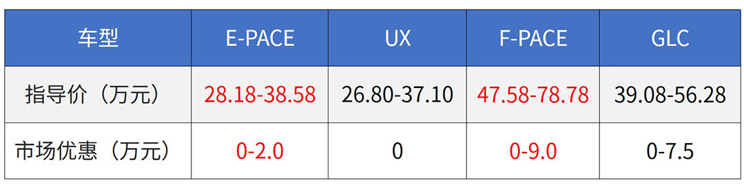 行胜于言,举例说明。以捷豹PACE家族中的E-PACE、F-PACE与它的竞争对手雷克萨斯UX、奔驰GLC为例,深入分析,价格也好,市场优惠也罢,捷豹PACE家族均处于主流的水准,颇具竞争力。