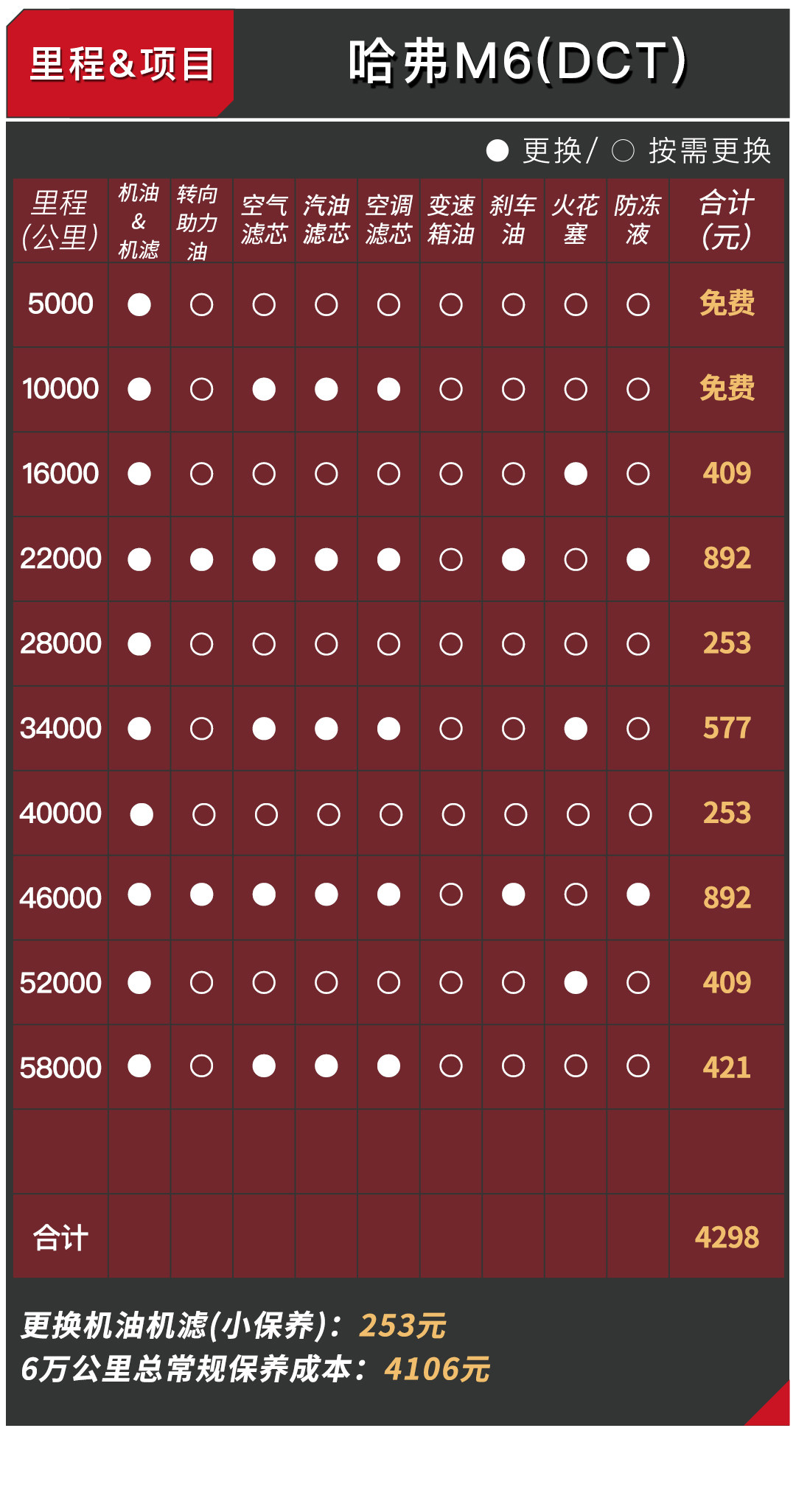 怎么样,大家是不是觉得哈弗M6是很划算的选择,教授开头做统计的时候也是这样认为。但实际不难看出省的钱都去哪了,首先首保和二保免费用的机油是矿物油,这种机油的价格虽然低廉,但其使用寿命、润滑性能等都较半合成油和合成油逊色,可以说是最次的机油,所以为了发动机好,建议二保后的保养加钱换成半合成机油更加靠谱,但是保养价格优惠相对变高了。不过总的来说,哈弗M6无论是车型的性价比还是保养的性价比都相当不错,感兴趣又怕保养贵的朋友可以放心选购了。
