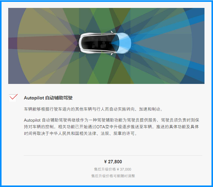 再举一个例子,特斯拉,其卖点有两大:自动辅助驾驶、纯电动,但旗下全系车型的Autopilot自动辅助驾驶(27800元)和全自动驾驶功能(46300元)都是需要选装。