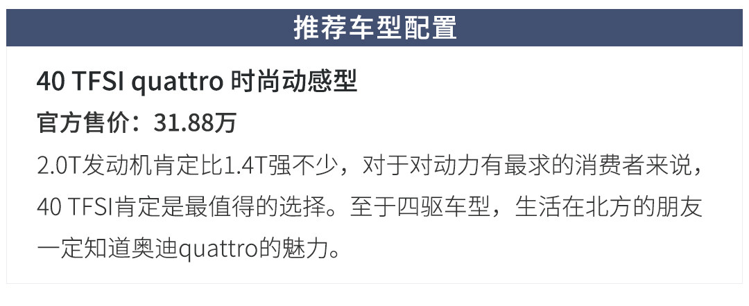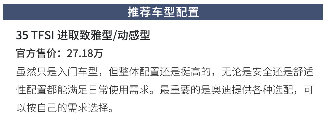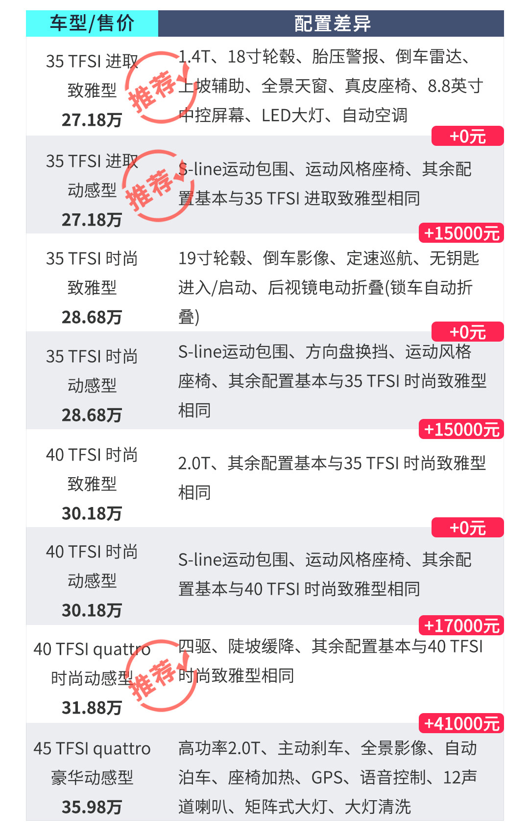 虽然Q3有着高达8款的配置车型,但仔细看很容易发现其实也就几款车型,大致分为进取、时尚和豪华。至于进取和时尚里的致雅型和动感型主要的区别在于动感型拥有S-line运动外观套件和运动风格座椅,而致雅型则是普通版车型。