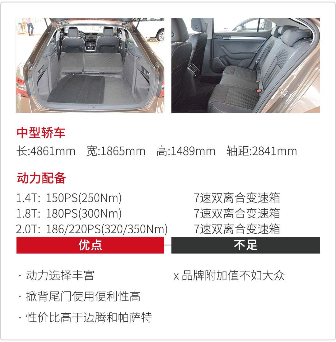 其实你可以把斯柯达速派理解成换壳换标的大众迈腾或是帕萨特,这是因为三台车共用了大量的机械部件,都是一样的MQB平台、一样的EA211和EA888引擎,以及一样的双离合变速箱,甚至连内部空间也相差无几,更别说速派还有装卸物品十分方便的掀背式尾门了。所以说在速派的价格比相似配置的迈腾和帕萨特都低了两三万的前提下,教授无疑更推荐大家去购买速派。