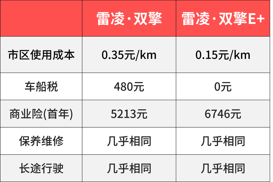 每天上下班为20公里,一年250个工作日,两者的一年的使用成本差为1000元,加上车船税每年480,雷凌E+会比雷凌·双擎年使用便宜1480元。但是要看到他们俩的保险第一年就差了1500元左右,以后每年雷凌E+都会比雷凌·双擎多缴纳一些保险费用。即便保险费的差距越来越小,雷凌E+通过后期使用追回成本几乎是不可能的事情。所以非限牌城市选择雷凌双擎即可。