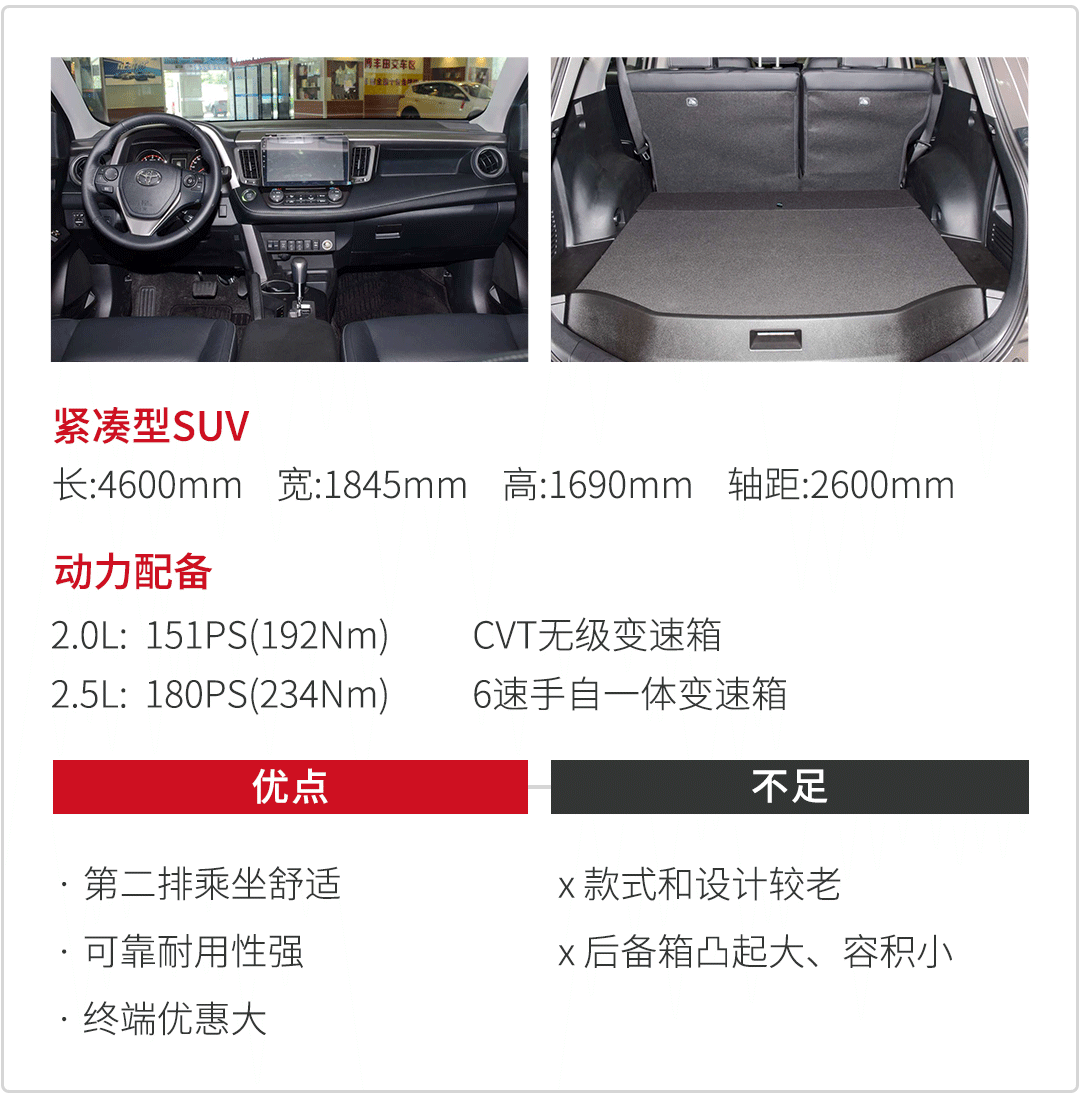 丰田的RAV4荣放是紧凑型城市SUV这一车型的开山鼻祖,并且每一处设计都体现着日系车实用至上的原则,比如它的第二排就是同级别中最宽敞最舒适的存在,养护成本也非常低。而且RAV4的可靠性非常高,你基本不用担心车子会出故障把你抛在半路。不过,这一代RAV4临近换代,新款在年内很快就会国产,因此现款RAV4外观内饰设计相对没那么潮流,但好处则是终端优惠很大,不少地区优惠幅度都达到了2.5-3万元。