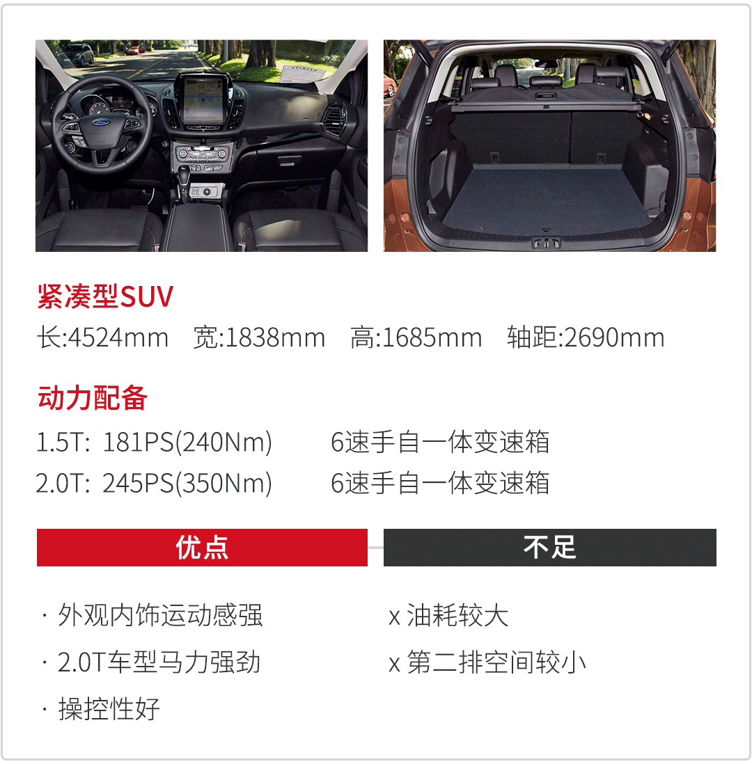 毫无疑问,翼虎最大的优势就是继承了福特品牌在同级车当中数一数二的动力性和操控性,特别是其2.0T车型,最大功率达到了245匹,这个数字在紧凑型SUV当中可是非常强悍的动力了。翼虎是一台各方面都向驾驶性倾斜让步的SUV,因此作为代价,其整车尺寸和空间较为紧凑,乘坐空间特别是第二排的空间方面不是它的强项。