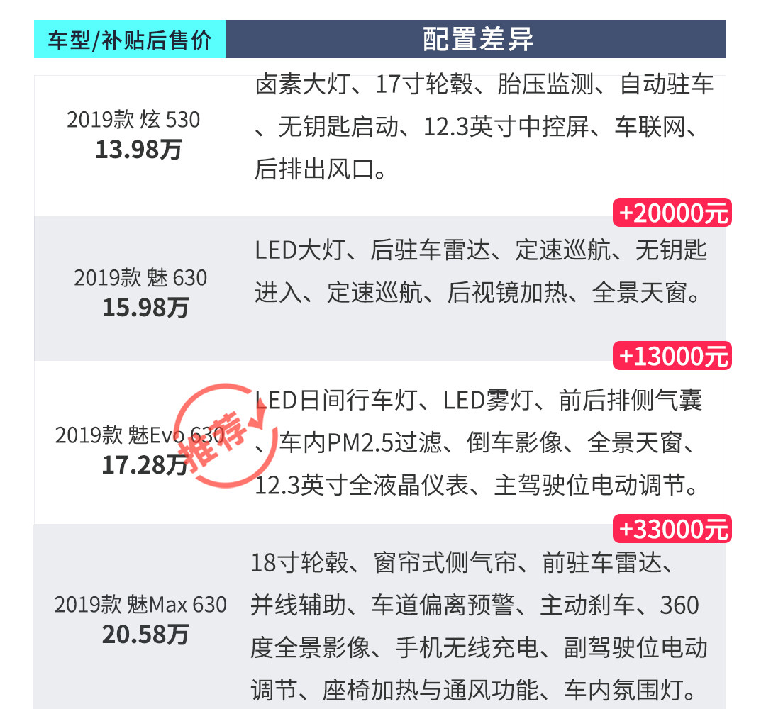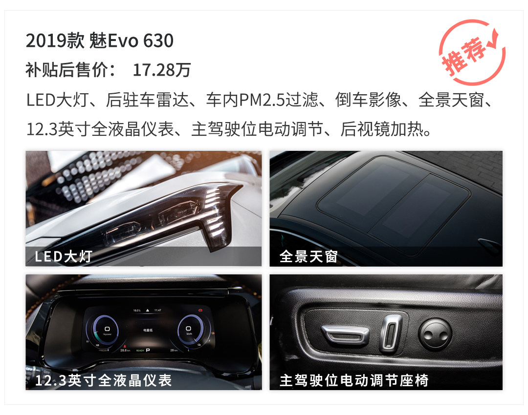 魅 630的配置已经满足日常家庭使用的水准了,但更加推荐魅 Evo 630的版本。两者售价差距不算非常大,后者除了有更加安全的配置表现外,倒车影像、全景天窗以及电动调节座椅也都是目前消费者接受度较高的车辆配置。