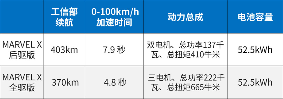 而荣威MARVEL X提供了后驱和全驱两款动力配置车型,前者拥有186马力而后者则拥有302马力!两者差价4万元,相对而言后驱车型更能提供长续航里程,它的工信部续航里程达到403km,而全驱车型的工信部续航里程则为370km。