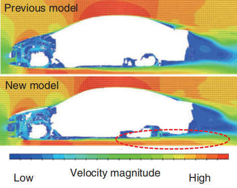 就拿上一代和这一代思域做对比吧,虽然两款车尺寸没有很大变化,但新款底盘后桥周围的气流速度更快,也就是后桥的升力更小,高速行驶稳定性更好。
