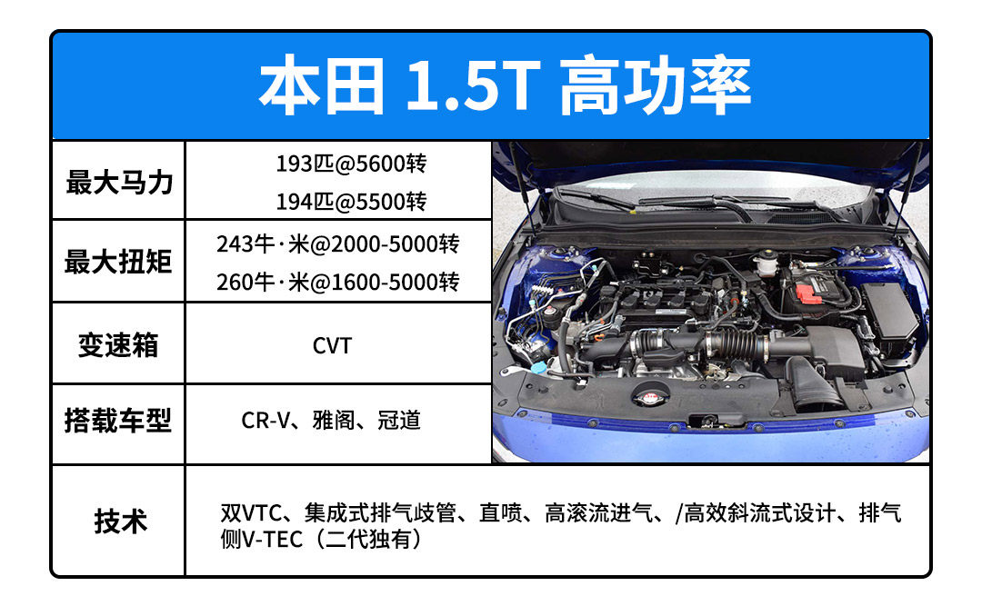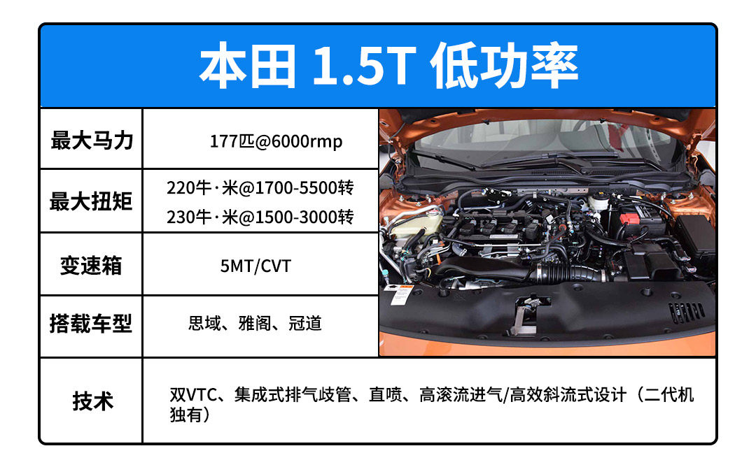 本田的1.5T低功版有两代,他们的区别是涡轮,第二代采用更加高效的斜流式叶片设计,更加容易推动,所以低扭来得更快,但是扭矩平原窄,高转的声音闷闷的,动力也不畅快。一代给人的感受反而更好一些。二代有个绝妙的好处,机油不会增多。