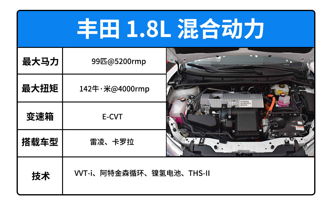 丰田的1.8L混合动力系统应该是目前能买到最便宜的合资混合动力系统。可靠耐用,镍氢电池无枝晶产生,不会刺穿隔膜引起短路着火,非常安全。这套动力系统的节油和平顺性十分好,发动机启动和介入的动作让人难以察觉。