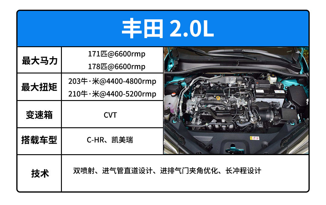 这台全新的2.0L是丰田Dynamic Force系列的发动机。这台发动机热效率不错,马力和扭矩数字也不错。不过笔者不是很喜欢它的驾驶感受。