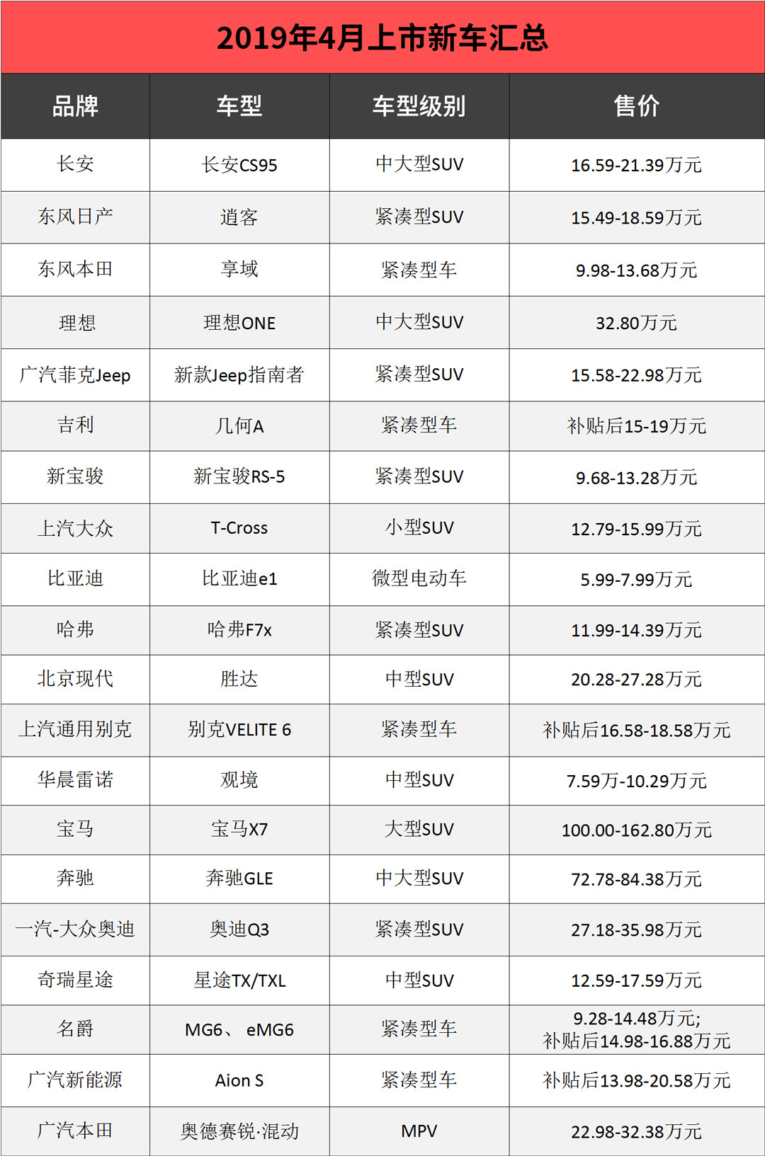 今天,教授和大家回顾一下4月上市的新车,我们先通过一份表格看看4月上市的新车吧。