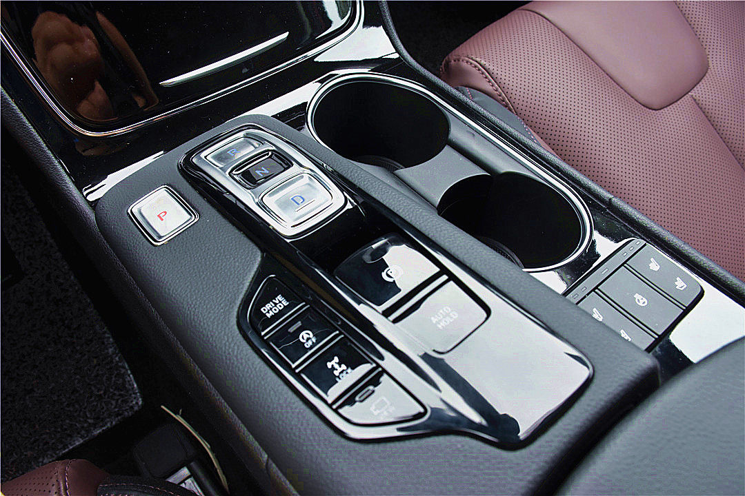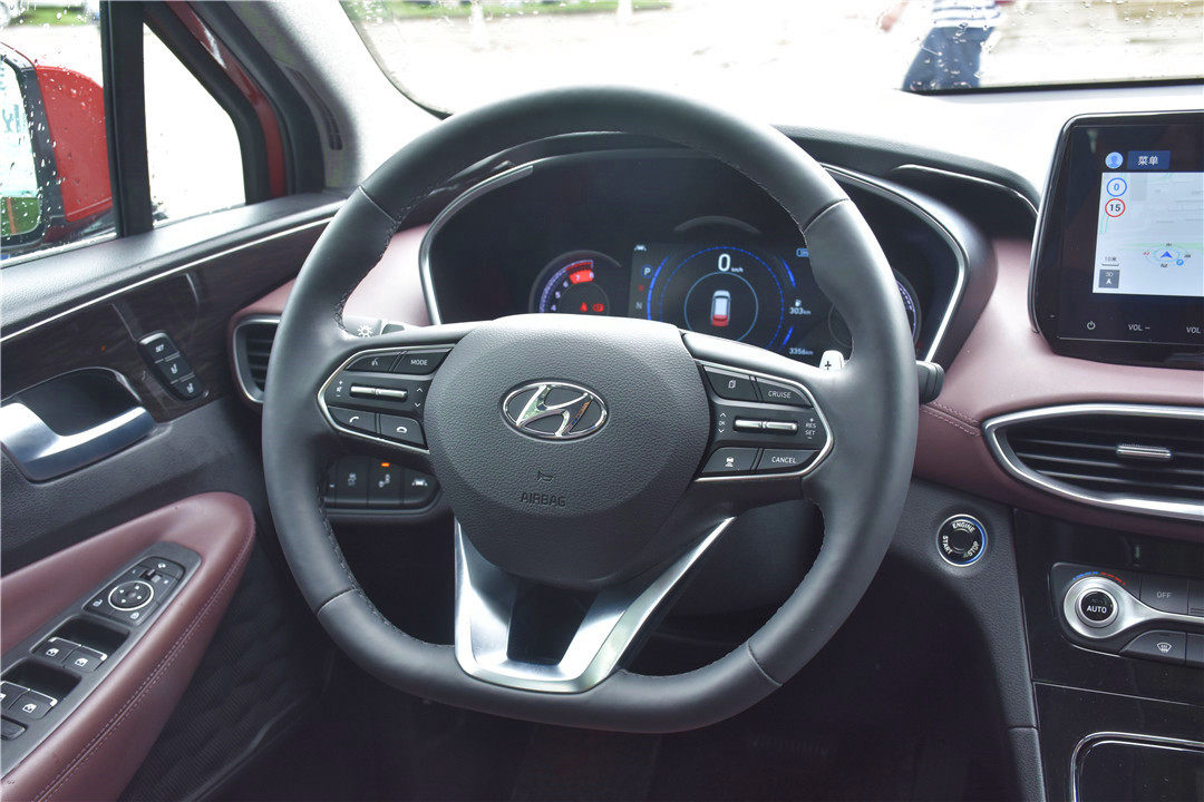 值得一说的是第四代胜达采用了D字形的平底方向盘,盘幅粗细适中,握感良好,并全系标配换挡拨片,这样的配置在这个级别的SUV上很少见,难道在7座SUV也要营造运动感?