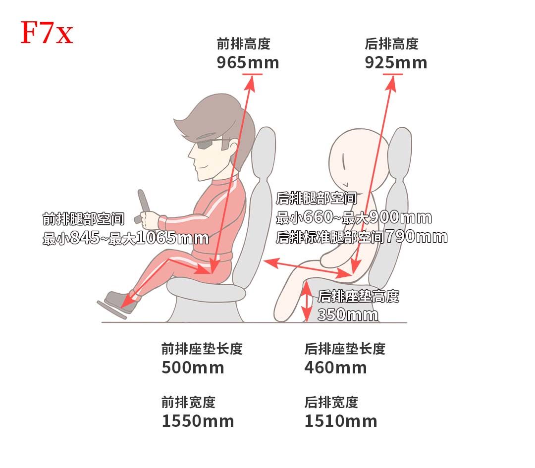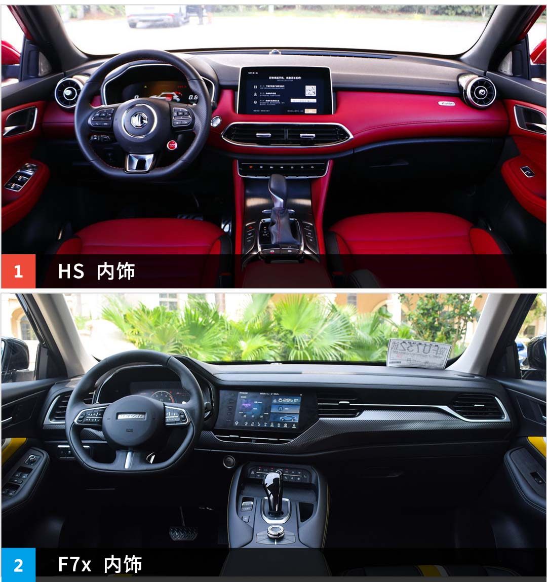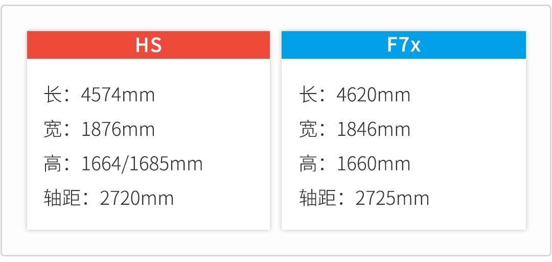首先从三围和轴距数据来看,双方互有胜负。F7x在长度和轴距先下一城,反过头来HS就在宽度和高度扳回一城。