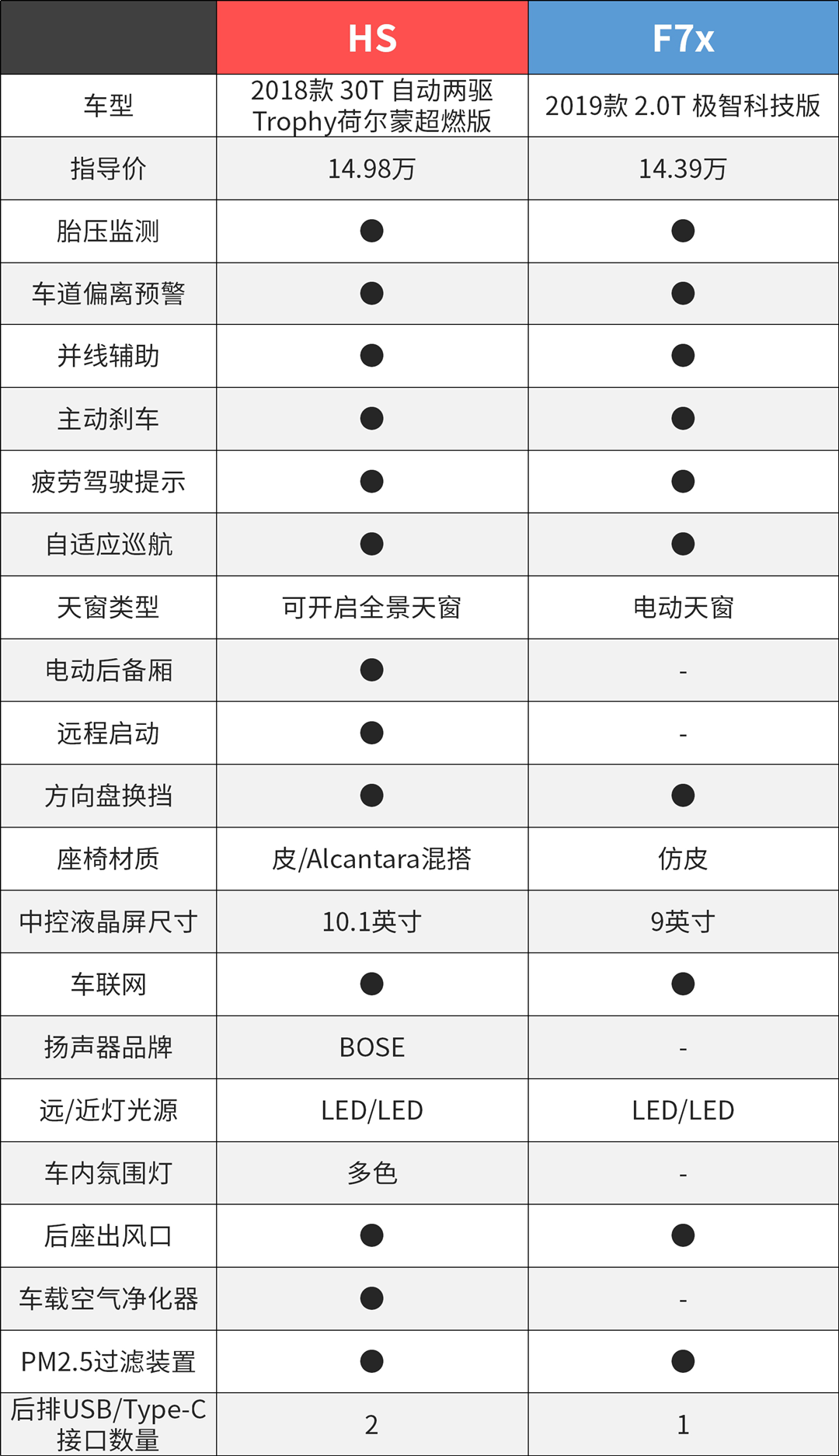 配置层面选取两款车型价格相近的两驱顶配配置进行对比,不难发现安全性、实用性、舒适性、智能化的配置相当齐备,应付一般家用已经足够,讲求性价比对高端配置无过多需求,F7x是一个不错的选择。