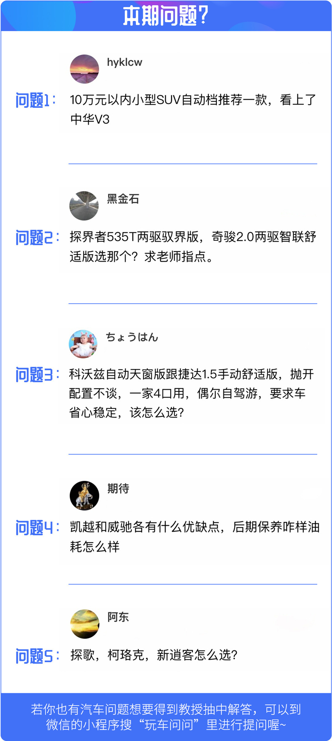 在网友问答栏目中教授将会在小程序-玩车问问里挑选5个问题进行回复,如果对购车、用车有什么疑问的话,欢迎点击下方玩车问问小程序,有许许多多非常厉害的技师为你解答喔!