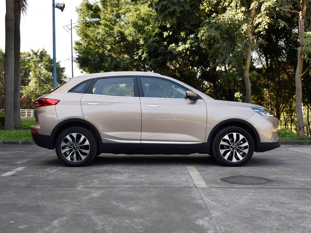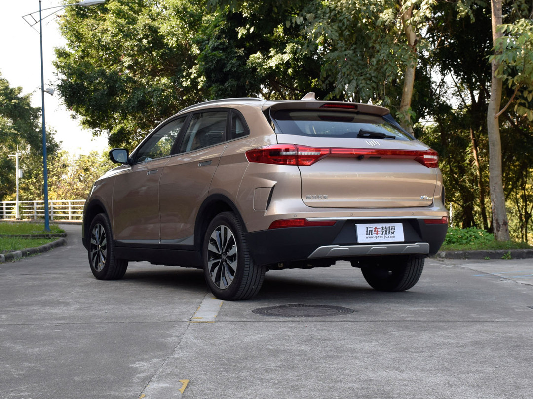 侧面来看,GE3的造型更加偏向传统的SUV造型,从车头延伸到车尾的线条相当流畅,并且更加直立的尾门能够给予车内更大的成员空间,由于GE3没有像威马EX5那样使用黑色的防擦条设计,所以GE3侧面看起来更加的厚实,同时18寸的轮毂也充满了GE3的轮拱,整车侧面相当协调。
